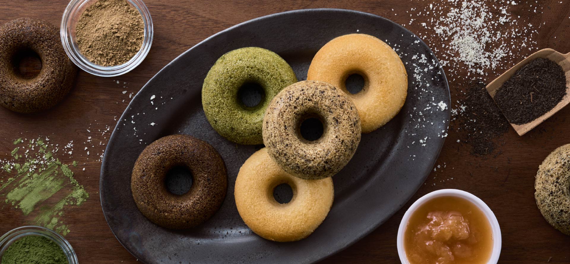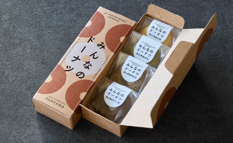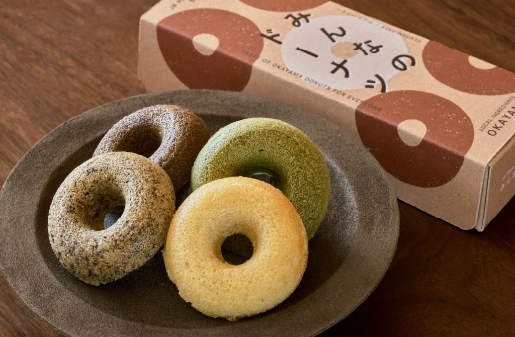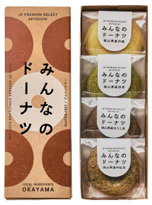 「みんなのドーナツ」は、岡山県産白桃、岡山県真庭市産の抹茶、ほうじ茶、和紅茶の4種類の味わいをお楽しみいただけます。それぞれの素材が持つ、やさしい甘みと香りを、ぜひ味わってみてください。