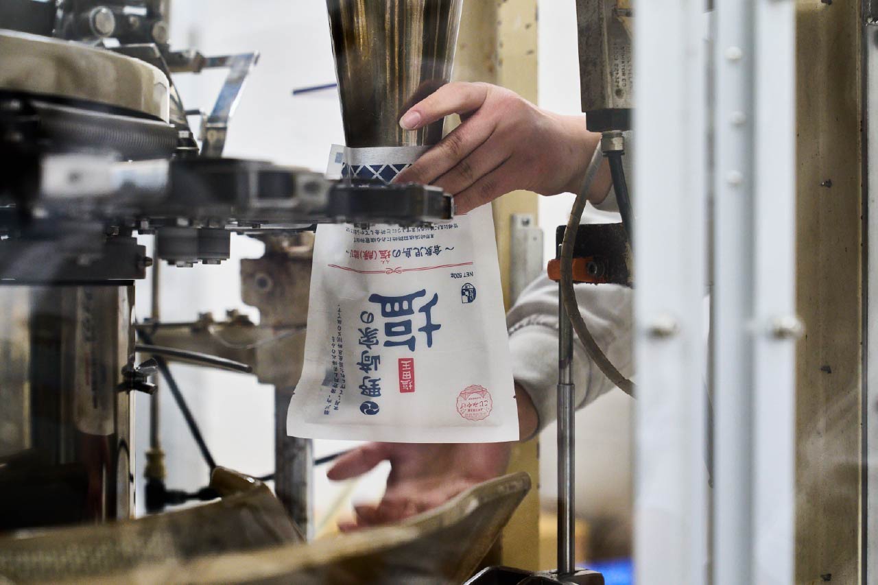 同社の長畑 亮佑(ながはた りょうすけ)さんは「塩田王 野﨑家の塩にはニガリ(苦汁)を入れて製造しています。法律上、同一敷地内で同じ海水から塩とニガリがつくられている場合は、原材料表示は海水のみになるんです。だから塩田王 野﨑家の塩の原材料表示は、海水のみ。同じ敷地で一貫してつくられている弊社ならではの強みです。これはお客様の食への安心感にもつながっているのではないでしょうか」と話す。
