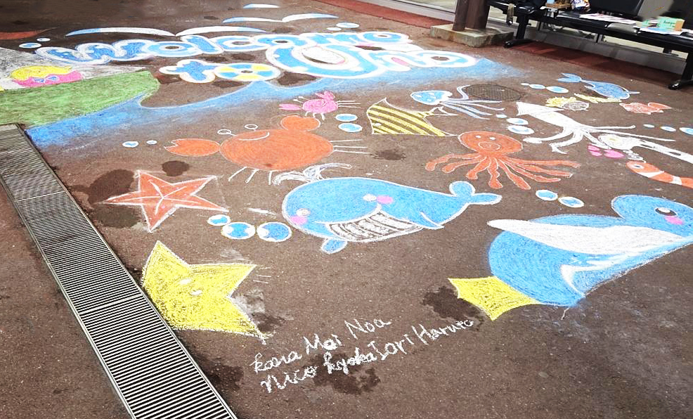 岡山県立玉野高等学校美術部によるチョークアート。宇野駅では花壇なども設置して華やかに芸術祭の開幕を盛り上げた。