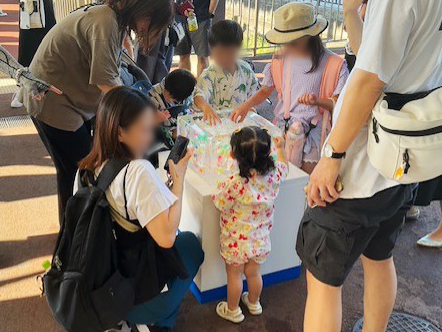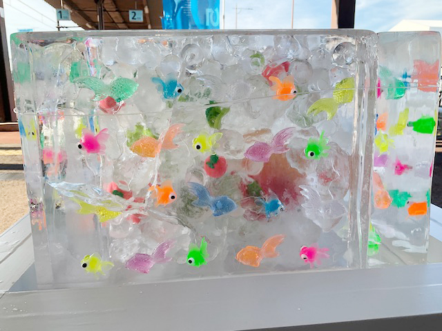 玉野まつりの日に設置した、いろとりどりの金魚のモチーフを埋め込んだ涼しげな装飾の「氷柱」。