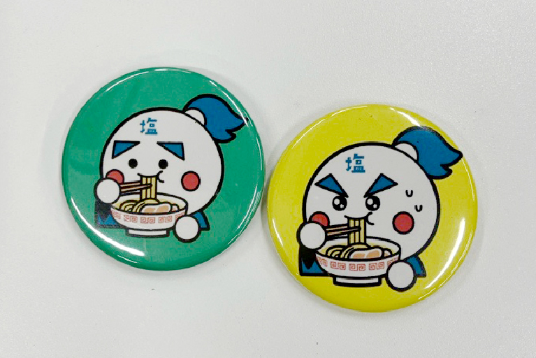 宇野駅でも好評だったオリジナル缶バッチは、児島ならではのキャラクター「しおざえもん」をあしらったものを、児島観光港から本島行きのフェリー出航に合わせて、対象列車で到着された来訪者に配布しています(※数量限定)。