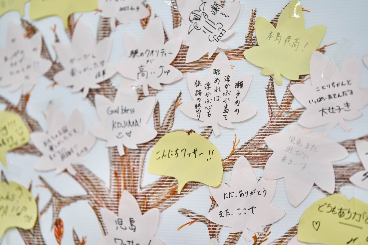 児島駅では、「旅の思い出掲示板」も設置。日本語だけでなく中国語や韓国語、英語など、さまざまな国の言葉で彩られる寄せ書きから、国境を越えた交流のあたたかさが伝わってきます。