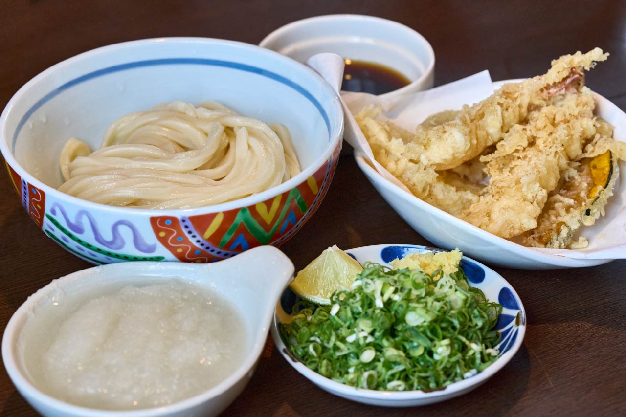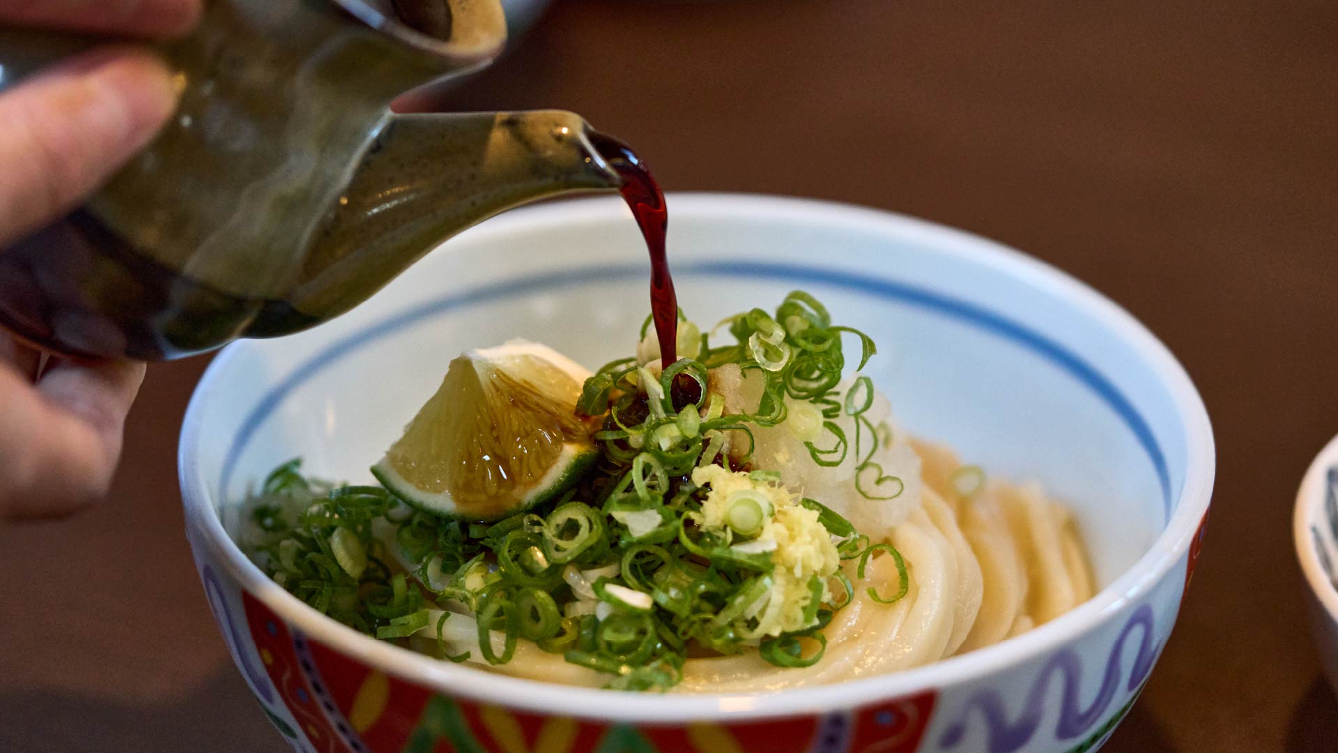 児島駅から歩いて約10分。地元で長く愛されている「たかとうどん本店」に到着。看板メニューは「しょうゆうどん」。ゆでたてのコシのある麺に、たっぷりの大根おろしと薬味を添え、仕上げにしょうゆをひとまわしかけていただくシンプルな一品です。