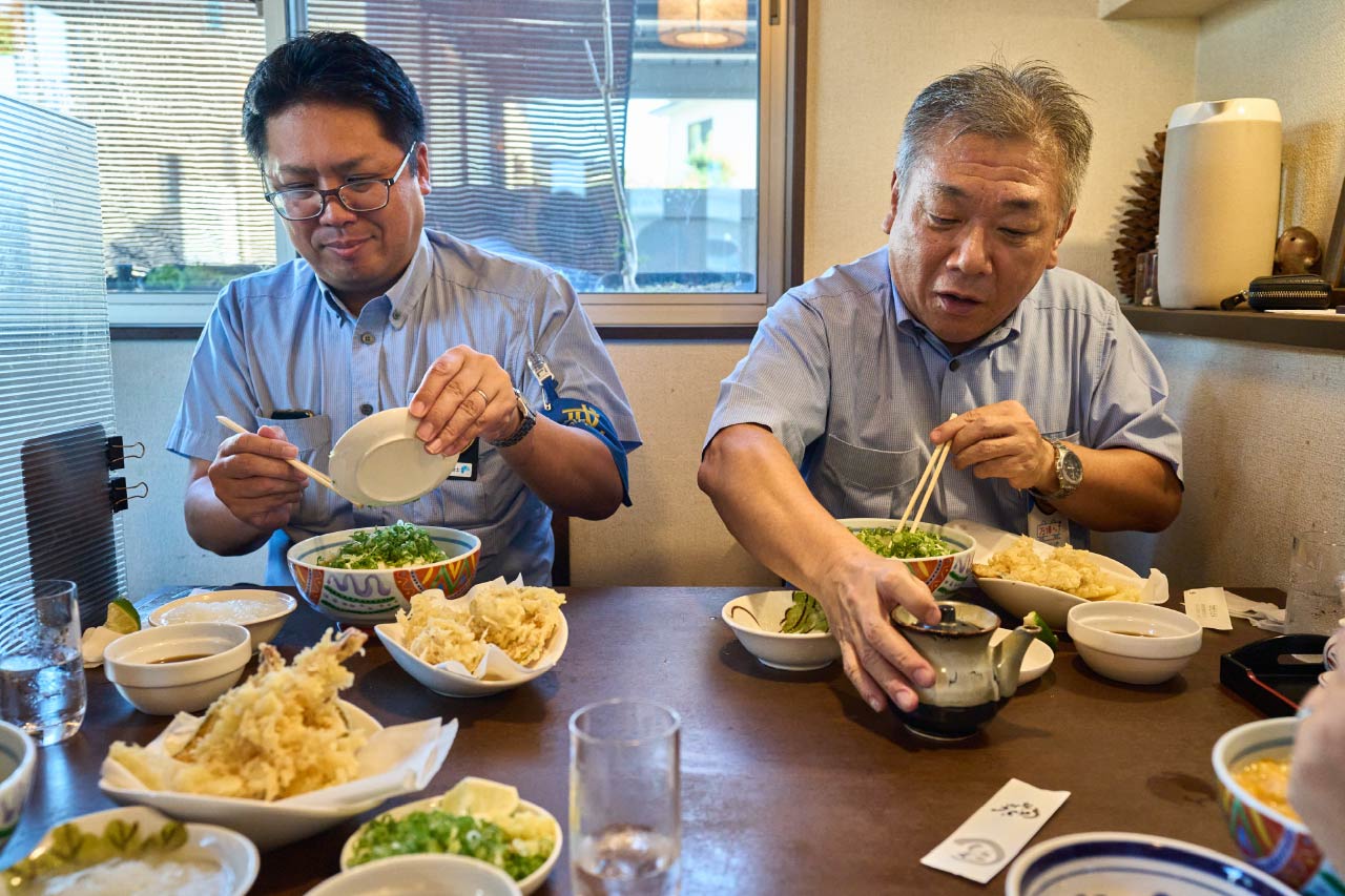 高橋駅長と井上副駅長が選んだのは、しょうゆうどんに、とりの天ぷらがセットになった「とり天しょうゆうどん」。