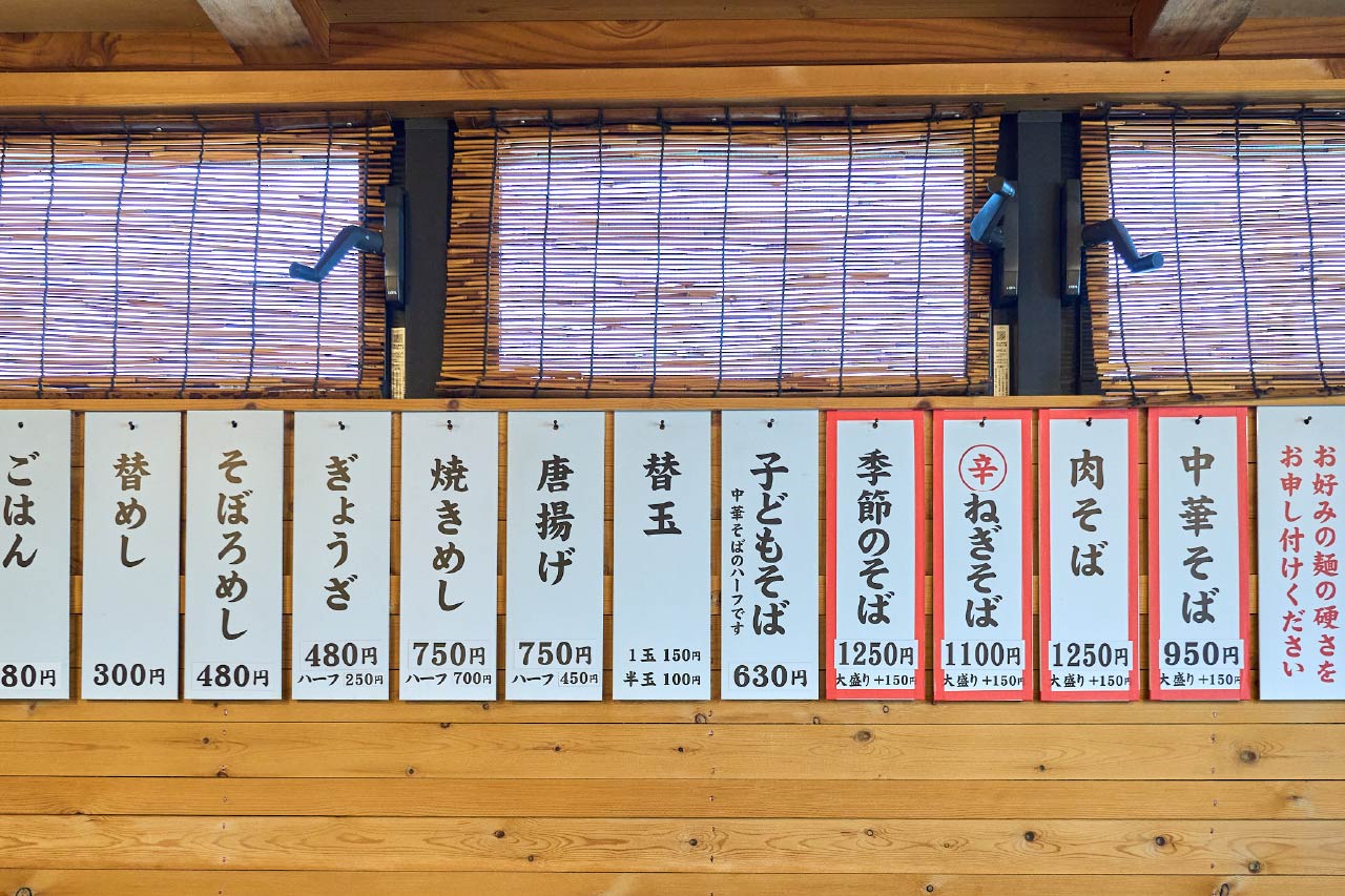 中華そば(950円)、辛ねぎそば(1,100円)、焼きめし(750円)のほか、餃子や唐揚げなど豊富な定番メニューも楽しめる。