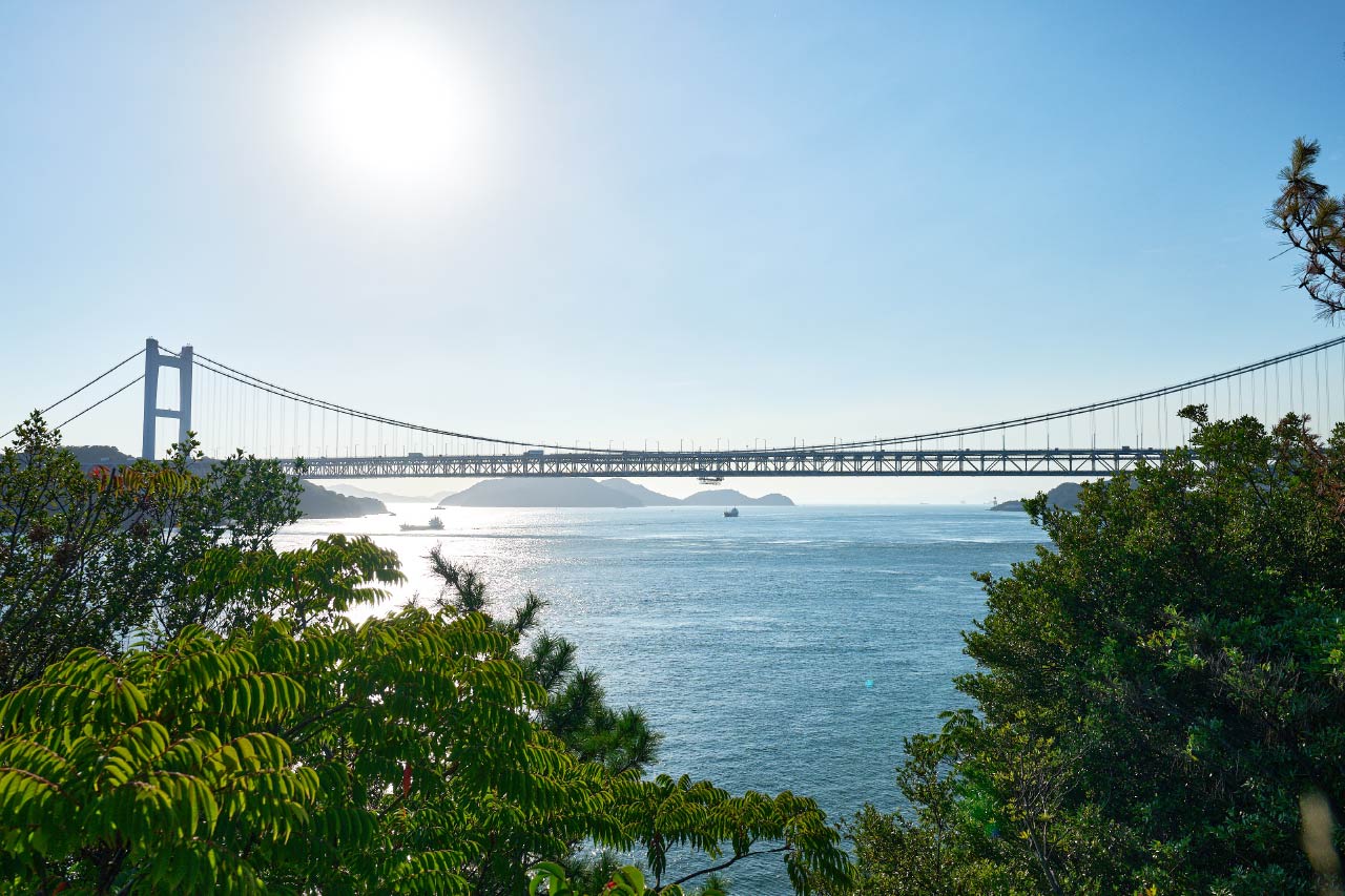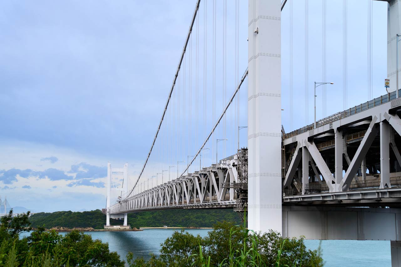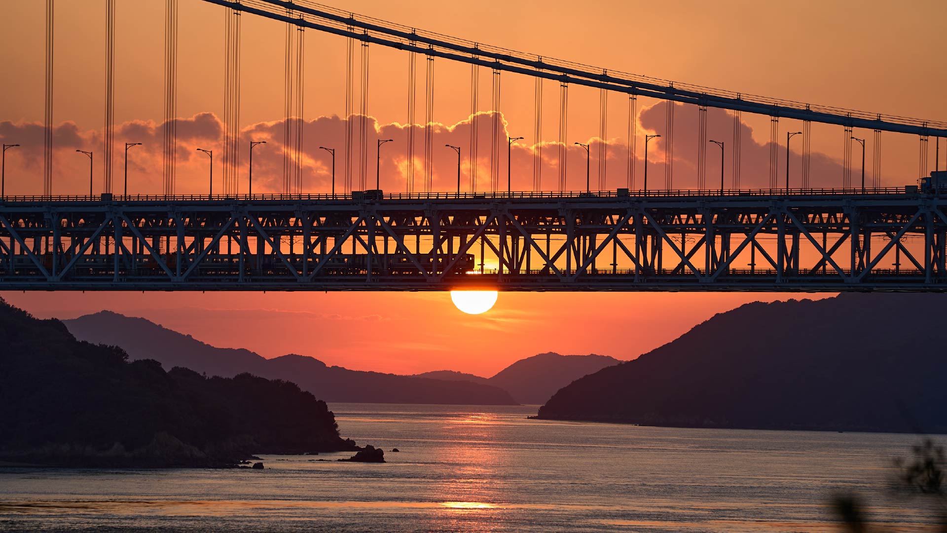 瀬戸大橋は、岡山県倉敷市と香川県坂出市を結ぶ全長約13kmの橋で1988年に開通しました。道路と鉄道が通る二層構造が特徴で、吊橋・斜張橋・トラス橋など、構造の異なる複数の橋によって構成されています。機能性とデザイン性を兼ね備えた名橋としても知られ、島々の間を縫うように架かるその姿は瀬戸内海の穏やかな風景と調和し、まさに人と自然の共演といえます。