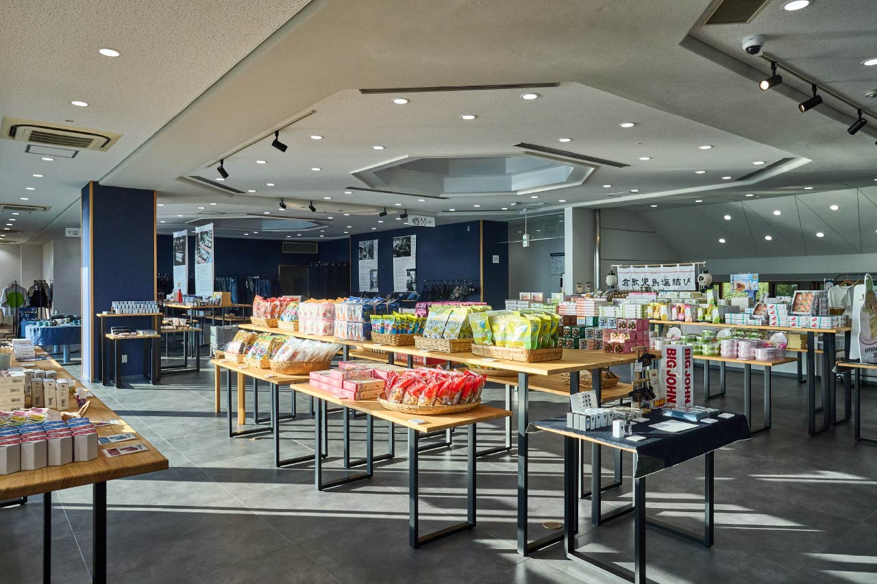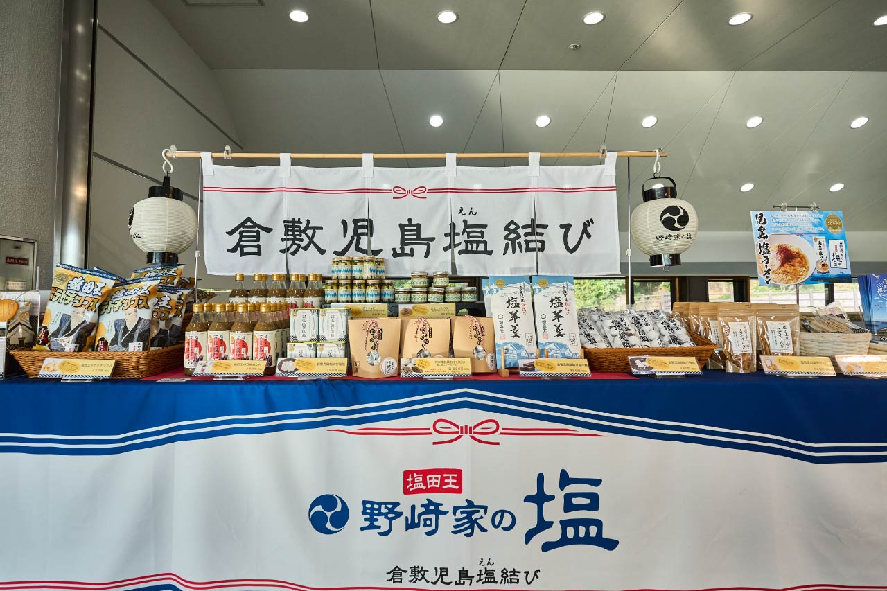 店内には、倉敷児島塩結びプロジェクトの「塩田王 野崎家の塩」や、その塩を使った加工品をはじめ、児島唐琴地区の「髙田織物」が手がける畳縁シリーズ、児島のデニム製品やTシャツなど、岡山県内の名産品が多彩に並びます。