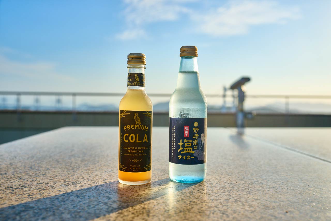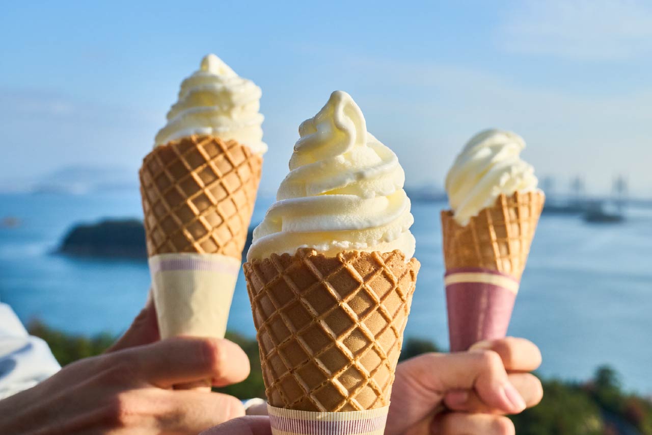 屋外デッキも併設され、瀬戸内海を眺めながら倉敷産のレモンを使用した「倉敷プレミアムコーラ」や「塩田王 野崎家の塩サイダー」など、地域性豊かなドリンクも楽しめます。倉敷市下津井で牧場を営む「なんば牧場」のソフトクリームは、甘さ控えめでさっぱりとしたミルクの味わいが人気の一品です。