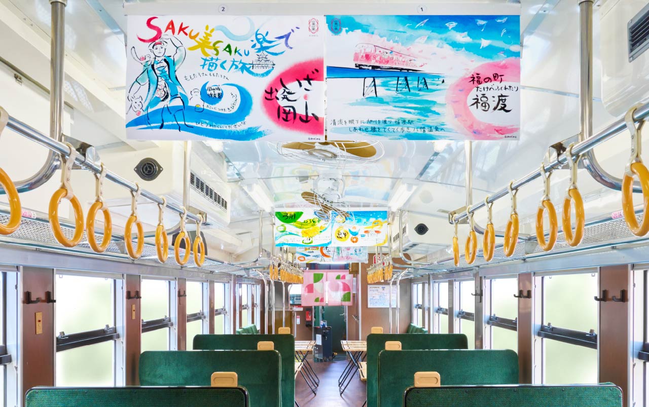 岡山県北エリアをめぐる観光列車「SAKU美SAKU楽」。津山線の沿線をめぐって描いた6枚の水彩画が、中吊りポスターとなり車内を彩っている。手掛けたのは岡山市建部町出身のおかだ美保さん。きりっと勇ましい岡山駅の桃太郎像や、夜空を見上げる亀甲駅舎のユーモラスな亀の表情など、ストーリー性を感じる絵と美しい色使いに感性が刺激され、旅行気分を高めてくれる。