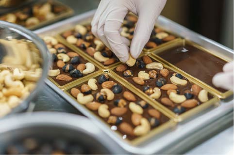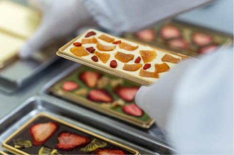 ベースとなるチョコレートとトッピングの組み合わせは、果物など素材そのものが持つ味や香りと向き合いながら、何度も試作を重ねてたどり着いたもの。