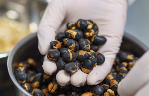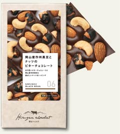 ほろ苦いビターチョコレートに岡山産作州黒豆と香ばしいナッツをトッピング。
