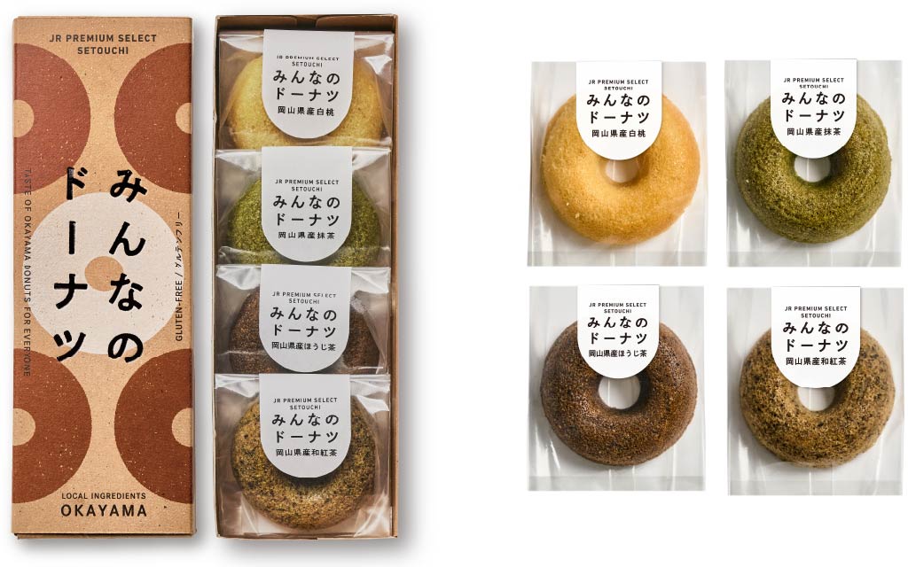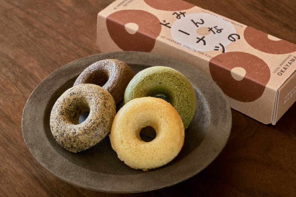 製造を手がけるのは、小麦・卵・乳などのアレルギー特定原材料8品目を使わないお菓子の製造販売を行っている、岡山市の株式会社いぶきです。「みんなのドーナツ」は米粉や豆乳、おからパウダーなどを使用しており、岡山県産の白桃、抹茶、ほうじ茶、和紅茶を使った4種類をラインナップしております。岡山県産素材をいかした、素朴でやさしい味わいをお楽しみいただけます。